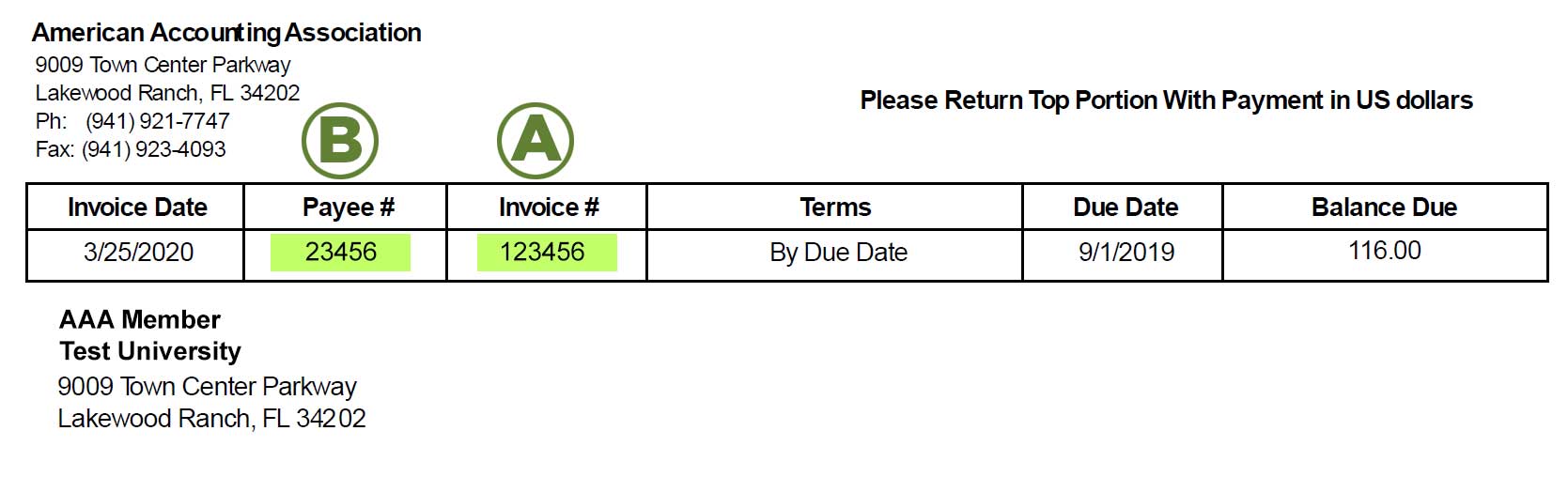 To pay an invoice using the tool below, first locate your invoice (sample at right) and identify the Invoice # indicated by the highlight labeled A, and the Payee # indicated by the highlight labeled B.